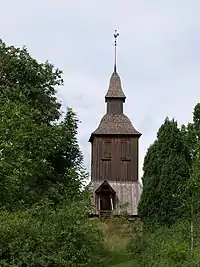 The bell tower at Gryta Church was built in 1752.[4] In the oldest records of the church (from the middle of the 17th century), notations are made about repairs to the tower. In the modern records about the church, the bell tower, made of tarred wood, is noted to be of special interest since it is an original 18th-century tower.[1] It has two bells, the Great Bell (Storklockan) and the Small Bell (Lillklockan).[4]