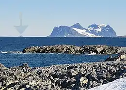 ![]() The tiny Guébriant Islands (at arrow) seen from Rothera Point on Adelaide Island. The larger island on the right is Jenny Island. | |