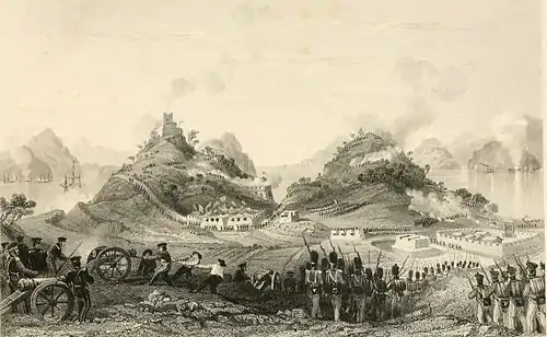 Guan Tianpei (simplified Chinese: 关天培; traditional Chinese: 關天培; Wade–Giles: Kuan1 T'ien1-p'ei2; 1781 – 26 February 1841), courtesy name Zhongyin (仲因), art name Zipu (滋圃), was a Chinese admiral of the Qing dynasty who served in the First Opium War.[1] His Chinese title was "Commander-in-Chief of Naval Forces".[2] In 1838, he established courteous relations with British Rear-Admiral Frederick Maitland.[3] Guan fought in the First Battle of Chuenpi (1839), the Second Battle of Chuenpi (1841), and the Battle of the Bogue (1841). The British account described his death in the Anunghoy forts during the Battle of the Bogue on 26 February 1841 as follows:
