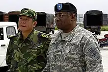 ![]() U.S. Army Brig. Gen. Charles W. Hopper (right), defense attache at the United States Embassy Beijing, observes relief operations with Senior Captain Guan Youfei, deputy director for the Chinese Defense Ministry's foreign affairs office in 2008. | |