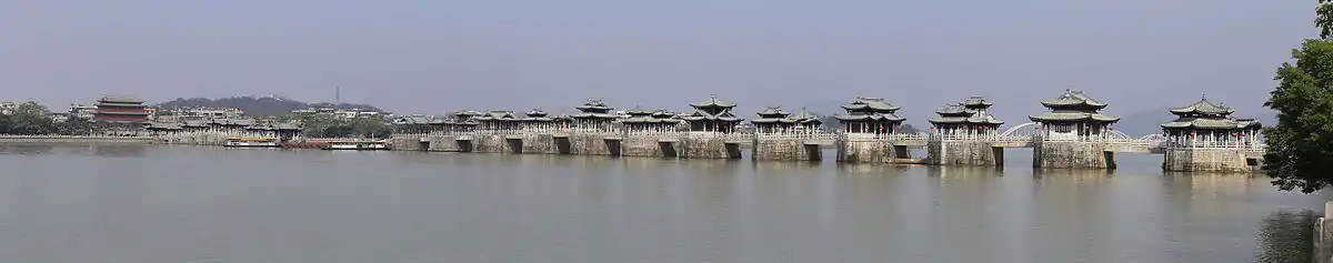 Guangji Bridge (simplified Chinese: 广济桥; traditional Chinese: 廣濟橋; pinyin: Guǎngjì Qiáo; lit. 'Great Charity Bridge'), also known as Xiangzi Bridge (simplified Chinese: 湘子桥; traditional Chinese: 湘子橋; pinyin: Xiāngzǐ Qiáo), is an ancient bridge that crosses the Han River east of Chaozhou, Guangdong province, China.[1] A key cultural relic under national protection, the bridge is renowned as one of China's four famous ancient bridges, the other three being Zhaozhou Bridge, Lugou Bridge, and Luoyang Bridge.[2]