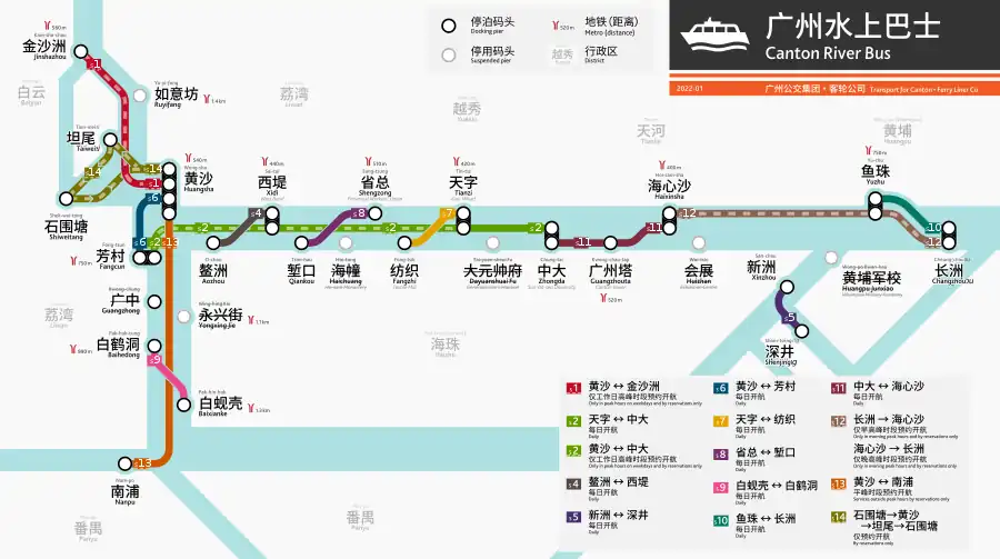 - ↑ Lin, Ling (2013-09-11). "本月广州水上巴士重现 新增至8航线" [Water bus will expand to 8 routes this month]. Yangcheng Evening News. Retrieved 2020-01-04.