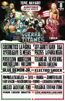 ![]() Promotional poster for the event, featuring Faby Apache, La Parka, Blue Demon Jr., Psycho Clown, El Mesías, El Texano Jr., Cibernético, El Hijo del Perro Aguayo, Electroshock, Jeff Jarrett and Taya | |||