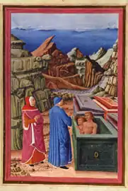 Guido Cavalcanti indirectly appears twice in Dante's Divine Comedy. The first occurs in Inferno X, where Dante encounters the souls of heretics. They are condemned in the sixth circle of Hell, trapped inside burning tombs. Guido's father, Cavalcante de’ Cavalcanti, is among these heretics, and proceeds to ask Dante about his son. Dante refers to Guido in the past tense, thus leading Cavalcante to believe that Guido is dead. Dante, later feeling guilty, asks Farinata degli Uberti, another heretic, to inform Cavalcante that Guido remains alive.[4]