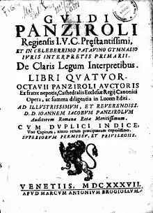 Guido Panciroli or Pancirolli[lower-alpha 1] (17 April 1523 – 5 March 1599) was a sixteenth-century Italian antiquarian, historian, jurist and law professor at Ferrara, Padua and Turin.[2] In his time he was renowned as a legal scholar, teaching students who came from all around Europe.[3] Posthumously, he was well known for his innovative comparative survey, Rerum memorabilium, iam olim deperditarum, that brought attention to the loss of knowledge since the ancient world.[4][5]