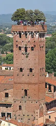 The tower dates from the 1300s, when a number of wealthy families were building bell towers within the walls of Lucca as status symbols. It is one of the few remaining towers within the walls. It is known for the tall trees (holm oaks) growing on top of the tower.