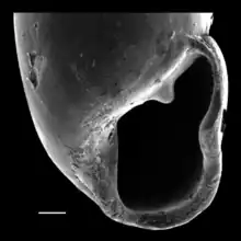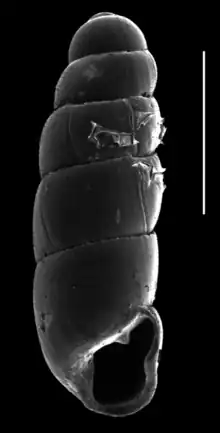 | SEM image of apertural view of paratype of Gulella streptostelopsis. The height of the shell is 2.37 mm. Scale bar is in mm. | |