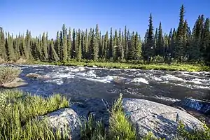 Floats on the Middle Fork Gulkana River usually start at the Delta National Wild and Scenic River Wayside along the Denali Highway and include lake segments and portages near the headwaters. It is also possible to take a floatplane to Dickey Lake and start from there. The West Fork Gulkana River and its two branches are also runnable but difficult to reach and navigate. In particular, portages on the South Branch route, which includes lakes and a segment of the Tyone River, are "arduous".[9] Hazards on these streams include Canyon Rapids, rated Class III to IV (difficult to very difficult) on the main stem, isolation, cold water, logjams, overhanging or submerged vegetation, portages of varying difficulty, and powerboats on the lower river.[9]