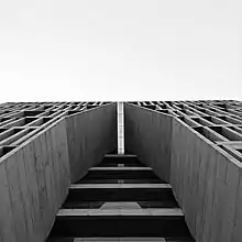 The seven story high modern building is constructed to give the impression of a monolith. It is made of white cast concrete. A screen structure running around the building provides light and ventilation to the inside. It is an abstract representation of “La-ilaha-illallah” in the Kufic script – the fundamental proclamation that there is only one God in Islam. The building was planned to accommodate a congregation of 2500. As the available plot of land was not large enough to build a mosque with the classic court-prayer hall sequence for that many people, the architect took a pragmatic approach and changed the usual layout of the mosque so that the stairs from the entrance directly lead to the main vestibule and prayer hall. Upper floors are accessible by elevators as well as by stairs.[4][5]