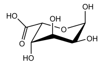 Guluronic acid is a uronic acid monosaccharide that may be derived from gulose.[1] l-Guluronic acid is a C-3 epimer of l-galacturonic acid and a C-5 epimer of d-mannuronic acid.[2] Along with d-mannuronic acid, l-guluronic acid is a component of alginic acid, a polysaccharide found in brown algae.[3] α-L-Guluronic acid has been found to bind divalent metal ions (such as calcium and strontium) through the carboxylate moiety and through the axial-equatorial-axial arrangement of hydroxyl groups found around the ring.[4]