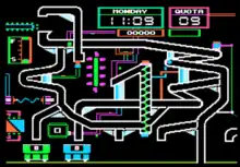 Gumball is an action video game in which the player works in a factory as a gumball sorter and sorts gumballs by color as they flow through a maze-like processing machine.[1][2] The player controls valves in the machine to divert the flow of individual gumballs towards bins of corresponding colors.[3] If the player sorts incorrectly, the foreman walks onscreen and dumps the gumballs out of the bin.[2] The player has a daily quota to meet by the end of the level's time limit.[1] If successful, the player character receives a promotion; the player watches an animation of a worker walking home from the factory, and progresses to a more complex level, with more color options to sort and defective, explosive gumballs to deactivate.[2] If unsuccessful in meeting the daily quota, the game ends and the player is left to restart from the beginning.[3]