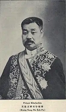 Gungsangnorbu[lower-alpha 1] (1871 – 1930) was an Inner Mongolian jasagh and politician of the Republic of China.[4] Some scholars describe him as a moderate, progressive moderniser caught between the influence of conservative older leaders and young radicals.[5] Others describe him less favourably as a conservative who, despite his early activities for promoting education, would go on to become protective of his own rights and interest as a member of the nobility, and suspicious of young Mongols who had received a modern education as potential challengers to those interests.[6]