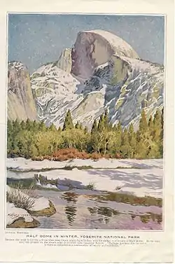 Soon after arriving in California in early 1921, Widforss made his way to Yosemite Valley. He made it his semi-regular home from 1921 to 1926. It was in Yosemite that he met National Park Service director Stephen T. Mather. Mather became a friend and patron and suggested that Widforss focus his talents on America's National Parks.[5] In 1923 Widforss illustrated Harold Symmes book "Songs of Yosemite."