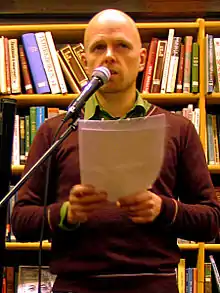 Norwegian author Gunstein Bakke reading from his book Maud og Aud at an evening of literature in Bygland, Norway.