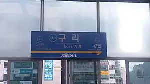 Guri station is a train station on the Gyeongui–Jungang Line. It is located in Inchang-dong, Guri, behind GS Square, a large department store in the central city area. Guri station is in Gyeonggi-do, whereas the previous western station, Yangwon station, is in Seoul.