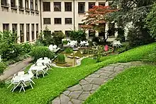 Small seating areas, covered promenade paths, natural stone walls, shrubs, intricate granite stone paths, and a small pond give an almost Mediterranean atmosphere.[3]