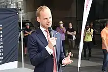 ![]() Gustav Kasselstrand speaking at Alternative for Sweden's meeting on the island of Långholmen in Stockholm on 11 August 2018 | |
