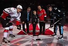 Guy Lafleur (right background) conducting a ceremonial faceoff prior to an American Hockey League game in 2013