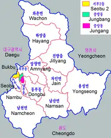 Gyeongsan is divided into 3 eup, 5 myeon and 7 dong. Amnyang was promoted to eup status on 1 January 2020.
