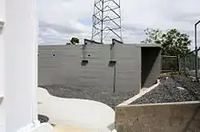 Butting against the north-east side of the strongroom, the rectangular pill box air raid shelter has off-form concrete blast walls, a concrete slab floor and flat roof. It has entrances at the north-east and south-west ends, each with an open porch sheltered by the cantilevered roof. Only the north-east end retains its interior concrete blast wall, which forms an entrance corridor into the main space of the shelter. The floor and ceiling are coved and there are three openings to the north-west and south-east sides housing pairs of eight-light casement windows. Original toilet cubicles remain at each end of the building. The exterior and parts of the interior are painted. A metal framed communications mast sits on the roof of the shelter, but this is not of cultural heritage significance.[1]
