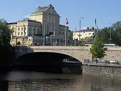 Hämeensilta (the ″Häme Bridge″) is a bridge in Tampere, Finland, crossing the Tammerkoski rapids. The main street of Tampere, Hämeenkatu, runs along the bridge, connecting the Kyttälä district to the western parts of the city center. Hämeensilta is one of the city's best known landmarks, especially famous for the statues on the rails of the bridge.[1] The arches of the bridge are made of concrete and they are coated with a red granite. The 68-metre-long (223 ft) Hämeensilta was completed in 1929.[2] It is named after the Finnish name of the Tavastia province.