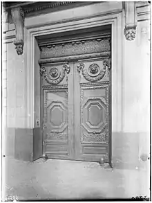 The Hôtel Hesselin was purchased in 1932[8] by the rich American cosmetics magnate Helena Rubinstein "for a song" and had tenants living in it. After nearly three years, when the last of the tenants moved out, Helena Rubinstein moved to have the hotel demolished despite the neighbouring residents and press protesting against the demolition.[9] She justified her decision by saying the foundations had been undermined by repeated flooding of the Seine. The hotel was demolished in 1935 at the request of Rubinstein,[10] and a new building was erected to the designs of the architect Louis Süe.[11] The new building incorporated elements from the original, including Le Hongre's doors from the carriage entryway[5] and an iron balcony, which had been declared a monument historique in 1927.[12]