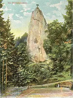 The Hübichenstein is an unusual rock formation in the Harz mountains, 50 meters in height, located on highway B242 about one kilometer northwest of Bad Grund, Lower Saxony, Germany. In 1897 it was crowned with a monument to Kaiser Wilhelm I, in the shape of an eagle with three-meter wingspan.