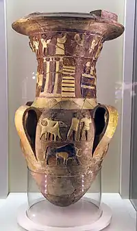 Hittite relief vases have been known since the excavations of Boğazköy (the Hittite capital of Hattusa). Fragments have also been found at Alişar, Alaca Höyük, Eskiyapar, Kabaklı, Elbistan-Karahöyük und Kaman-Kalehöyük. They have generally been dated to the early period of the Hittite Empire, in the first quarter of the second millennium BC. The sole reconstructed example was a four frieze vase from İnandıktepe, which is on display in the Museum of Anatolian Civilizations in Ankara, and a fragment with three friezes from Bitik. The motifs depicted on these vases consist of ritual activities, offering scenes, and festivals with acrobats, dancers and musicians.[4]