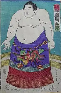 His real name was Miyokawa Toranosuke (三代川 寅之助) and was known for his large body and strength since he was a boy.[1] He joined Miyagino stable because the then head coach (Miyagino Umagoro) was from Makuhari, Chiba District and made his professional debut in May 1886 under the shikona Kikutayama (菊田山). It is thought that his first shikona was chosen to pay homage to his hometown shrine of Kikuta.[1] He was later given the shikona Araumi (荒海) in May 1887 before changing it to Ōtori (鳳) in January 1891. Upon promotion to juryō, in June 1892, he was given the shikona Hōō (鳳凰).