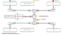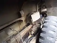 Saracen used an almost identical chassis and drivetrain to Saladin, although the engine was relocated from the rear to the front of the vehicle. The transmission used a 5-speed Wilson preselector gearbox with a fluid flywheel. Reverse gear was provided within the transfer box, allowing all five gears in either direction. The centre bevel boxes were included within the transfer box housing and had a slight overdrive to the drive shafts fore and aft. Each wheel station used double wishbones and torsion bars for suspension with four (three on the centre stations) shock absorbers.[11] Steering was applied to the centre wheels and a lever arrangement moved the front wheels by a proportionately larger amount.[12]