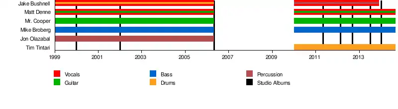 - Jake Bushnell – co-lead vocals (1999–2006, 2010–2013); drums (1999–2006); percussion (2010–2013)