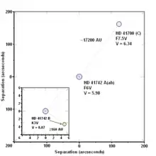 Lying at a considerably wider separation, HD 41700 was first observed relative to HD 41742 later than the tighter binary, despite being much brighter. The first measurement in the WDS dates to 1854 and was again made by Herschel, giving a position angle of 320° and a separation of 174".[12] More recent values agree on the position angle, but suggest a separation closer to 200". The wide separation of this tertiary component means that it has a separate Hipparcos entry to the primary, which confirms that the two stars lie at the same distance and are co-moving. The physical separation between the two is about 0.026 parsecs (0.084 light-years), or approximately 17200 AU.[15] This is comparable to the ~15000 AU separation between Alpha Centauri AB and Proxima Centauri; such wide separations between components are relatively rare, at least for solar-type stars.