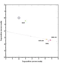 HD 41742 B was discovered early on in the history of visual binaries, due to the brightness of the primary. The earliest measurement in the Washington Double Star Catalog (WDS) dates to 1837 and was made by William Herschel, stating a position angle of 246° and a separation of 1.1" for the companion.[12] Surprisingly, recent measures suggest that the secondary has moved significantly over the two centuries since, with it lying at a position angle of around 215° and a separation increasing between 5.30" in the late 1970s[13] to 5.95" in 2010.[14] This translates to a minimum change in physical separation between 142 and 159 AU over 35 years,[10] which suggests that HD 41742 B is moving quickly away from the primary.
