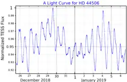 Emission lines were first noticed in HD 44506's spectrum in 1964.[16] They were again observed by Karl G. Heinze.[17] It has been suspected to be variable since 1963,[18] but a 1977 search for β Cepheids found inconclusive results; the star is variable in the visual passband but not the ultraviolet passband.[19] As of 2017, the GCVS lists HD 44506 as a suspected variable.[4] In 1982, HD 44506 was officially catalogued as a Be star by Mecerdes Jaschek and Daniel Egret.[20]