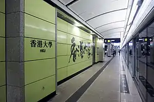 The station is located under Pok Fu Lam Road.[8] It has two tracks and one center island platform.[9] In addition, the MTR has built elevators to link HKU station to the University of Hong Kong.[10] The HKU station is located at a depth of 70 metres (230 ft), making it the deepest station in the MTR system upon its opening.[11][12]