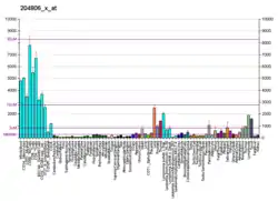 HLA class I histocompatibility antigen, alpha chain F is a protein that in humans is encoded by the HLA-F gene.[4][5] It is an empty intracellular molecule that encodes a non-classical heavy chain anchored to the membrane and forming a heterodimer with a β-2 microglobulin light chain. It belongs to the HLA class I heavy chain paralogues that separate from most of the HLA heavy chains. HLA-F is localized in the endoplasmic reticulum and Golgi apparatus, and is also unique in the sense that it exhibits few polymorphisms in the human population relative to the other HLA genes; however, there have been found different isoforms from numerous transcript variants found for the HLA-F gene. Its pathways include IFN-gamma signaling and CDK-mediated phosphorylation (cyclin-dependent kinase) and removal of the Saccharomyces cerevisiae Cdc6 protein, which is crucial for functional DNA replication.[6]