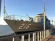 The financial crisis of 2007-2008 resulted in postponement of plans to preserve the vessel, and it was stored at the Gladstone Marina.[12] In late 2009, plans were announced to move Gladstone to a more prominent location, before mounting the vessel out of the water on a plinth when the museum upgrade is complete.[12] The patrol boat was relocated to a wet dock at East Shores in November 2014.[13] Gladstone is mounted on support cradles, and has undergone refurbishment and repainting before it was opened to the public.[13] At the start of 2015, opening to the public was predicted for around Easter 2015, although as of October, further work in making the ship safe and accessible was required.[13][14] In October 2015, $116,000 was allocated to the project by the Queensland state government from federal tourism funding.[14]