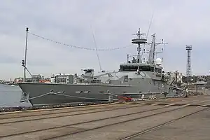 The main armament of the Armidale class is a Rafael Typhoon stabilised 25-millimetre (0.98 in) gun mount fitted with an M242 Bushmaster autocannon.[3] Two 12.7-millimetre (0.50 in) machine guns are also carried.[4] Boarding operations are performed by two 7.2-metre (24 ft), waterjet propelled rigid-hulled inflatable boats (RHIBs).[2] Each RHIB is stored in a dedicated cradle and davit, and is capable of operating independently from the patrol boat as it carries its own communications, navigation, and safety equipment.[2][5]