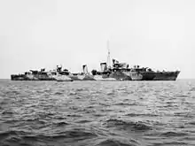 At the start of 1944, Warramunga helped cover the Landing at Saidor, before leaving Task Force 74 for refits in Sydney.[4] After rejoining the task fore at the start of February, Warramunga participated in amphibious landings in the Admiralties, at Tanamera Bay, Wakde-Sarmi, and Biak.[4] From May to July, the destroyer was assigned to patrol and escort duties.[4] On 22 July, Warramunga and the cruiser HMAS Australia sailed to Sydney for refits and leave.[4] Returning in August, the destroyer was involved in the Morotai landings on 15 September.[4] Warramunga was part of the covering force for the Leyte landings, and after Australia and USS Honolulu were damaged during the operation, escorted the two cruisers back to port for repairs.[4]