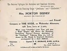 Once decommissioned, in 1874, the ship's engines were removed and she was loaned by the Admiralty to the charity that later became known as Shaftesbury Homes and Arethusa.[1] Retaining the name Arethusa, she was moored next to their existing training ship Chichester at Greenhithe, Kent. Shaftesbury Homes provided refuge and taught maritime skills to destitute young boys who had been sleeping rough on the streets of London and trained them for a career in the Royal Navy or Merchant Navy.