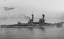 An experimental fire-control director was fitted in the forward spotting top and evaluated in May 1910.[11] The guns on the forward turret roof were transferred to the superstructure in 1913–1914 and the roof guns from the wing turrets were remounted in the aft superstructure about a year later; all of the four-inch guns in the superstructure were enclosed to better protect their crews. In addition, a single three-inch (76 mm) anti-aircraft (AA) gun was added on the former searchlight platform between the aft turrets. Shortly afterwards, the guns on the aft turret were removed as were one pair from the superstructure. Around the same time another three-inch AA gun was added to the aft turret roof.[12]