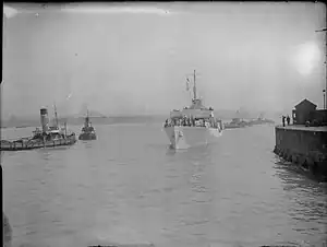 ![]() HMS Bellwort entering Victoria Wharf, Birkenhead during World War II | |
