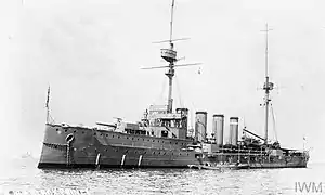 At the beginning of the First World War, Black Prince was one of the four armoured cruisers serving in the 1st Cruiser Squadron of the Mediterranean Fleet, commanded by Rear-Admiral Ernest Charles Thomas Troubridge. She participated in the pursuit of Goeben and Breslau. Following the escape of the two German ships to neutral Turkey, Black Prince and Duke of Edinburgh were sent into the Red Sea to search for German merchant ships, with Black Prince capturing the German ocean liners Südmark and Istria.[5] On 6 November, she was ordered to Gibraltar to join a squadron of French and British ships to search for German warships still at sea off the African coast. This was cancelled on 19 November after the location of the German East Asia Squadron was revealed by survivors of the Battle of Coronel.[6] Black Prince joined the Grand Fleet in December 1914 and was assigned to the 1st Cruiser Squadron under Rear-Admiral Sir Robert Keith Arbuthnot.[7]