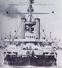 In 1897 one of these 3-pounder guns was mounted on each turret top and, three years later, the 3-pounders in the fighting tops were transferred to the forward superstructure. At the same time the above-water torpedo tubes were removed. About 1902–03 the 6-pounders on the main deck were removed; two were remounted on the superstructure, but the other two were not replaced. In 1905 the 3-pounders on the forward superstructure were removed while the 3-pounders in the lower fighting tops were removed while the ship was in reserve from 1907–09.[4]