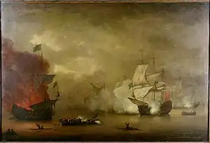 The battle is the subject of several works of art. James II, at the time Duke of York, commissioned an oil painting from Willem van de Velde the Elder depicting the moment when the leading Algerine ship entered the battle and engaged with Kingfisher.[4] There also exists a mezzotint by Elisha Kirkall of the battle, previously thought to depict a similar battle by John Kempthorne, Morgan's father; the original is either a painting by Willem van de Velde the Younger, or a copy by someone such as Cornelius van de Velde of a lost painting by the Younger.[5]:235