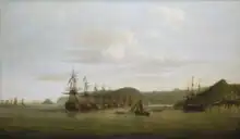 In action at St Lucia in December 1778. Barrington's flagship 'Prince of Wales', is last in the line, in stern view on the left