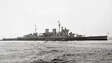 Renown finished her reconstruction in September 1926 and she was assigned to the Battlecruiser Squadron until the ship was detached to convey The Duke and Duchess of York to Australia between January and July 1927. On the return journey, a boiler room caught fire on 26 May, burning four ratings before it was put out.[21] Upon her return she rejoined the Atlantic Fleet. Renown became the flagship of the BCS when Hood was refitting between 1929 and 1931. Hood resumed the role as flagship after she was recommissioned and Renown was paid off for a refit of her own.[22] A High-Angle Control System Mark I (HACS) was fitted with a director on the roof of the fore-top that replaced the high-angle rangefinder and the conning tower platform was enlarged to accommodate a pair of Mark V octuple mounts for the 40-millimetre (1.6 in) QF 2-pounder Mark VIII gun[23] The Mark V mounts could depress to −10° and elevate to a maximum of 80°. The Mark VIII 2-pounder gun fired a 40-millimetre (1.6 in) 2-pound (0.91 kg) shell at a muzzle velocity of 2,040 ft/s (620 m/s) to a distance of 3,800 yards (3,500 m). The gun's rate of fire was approximately 96–98 rounds per minute.[24] Only one mount was initially available, however, and it, along with its director, was fitted on the starboard side.[23] Renown had her midships triple 4-inch mount removed to make room for an aircraft catapult that was not fitted until 1933. The port Mark V 2-pounder mount was finally fitted, albeit without its director, that same year. The ship now carried a Fairey III floatplane for reconnaissance purposes. The flying-off platform was also removed.[19]