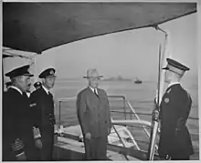 Renown returned to Britain to refit from February to June 1943; her catapult and aircraft were removed while the hangar was converted to a laundry and a cinema. She also received a total of 72 Oerlikon 20 mm light AA guns in 23 twin mounts and 26 single mounts fitted between July 1942 and August 1943. In January 1944 a quadruple "pom-pom" mounting was placed on the roof of 'B' turret and the 20mm guns there were re-sited elsewhere.[36] Additional light AA directors with Type 282 radars were also fitted during this time.[37] The ship brought Winston Churchill and his staff back from the Quebec Conference in September and conveyed them to the Cairo Conference in November. She rejoined the Home Fleet in December, just in time to be transferred to the Eastern Fleet a few weeks later. Renown arrived in Colombo at the end of January 1944 where she became flagship of the 1st Battle Squadron. In April she participated in Operation Cockpit, an air strike against port and oil facilities on Sabang, off the island of Sumatra.[38]