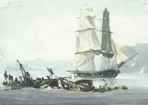 Cunningham was replaced by Commander George Cockburn in the command of Speedy, which remained in the Mediterranean.[1] His first duties were limited to carrying despatches and passengers between Toulon and Genoa, after which he was ordered to join Captain Sutherland of HMS Diadem, who was commanding a squadron blockading Genoa.[7] The small fleet was caught in winter storms and several ships were badly damaged, forcing Sutherland and his squadron to seek shelter in nearby ports and to make repairs, with the exception of Speedy, which remained on station.[7] Sutherland put into Hyères Bay and reported the dispersal of his squadron to Lord Hood, also noting that nothing had been heard of Speedy since the gales. Once Diadem had been repaired Sutherland returned to Genoa, and was surprised to discover Speedy still there patrolling the port, not once having left her task. While single-handedly maintaining the blockade, she had managed to capture several vessels.[8] Sutherland ordered Speedy, which was by now running desperately short of water, to Hyères to refit. At the same time, Sutherland sent a complimentary report of Cockburn to Lord Hood.[8] On 20 January 1794, Cockburn was rewarded with an acting commission as post-captain of the frigate HMS Inconstant, followed a month later by a permanent command of the frigate HMS Meleager.[8]