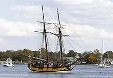 The replica vessel is not an exact reconstruction. It has a diesel auxiliary engine and otherwise conforms to Coast Guard regulations in order to carry passengers. The modern version is framed with osage orange and planked with oak; there is a lead ballast keel which the original did not have. She has only four guns, rather than the original eight. All work and can be fired. Within modern safety requirements, however, she was built following traditional methods as much as possible.